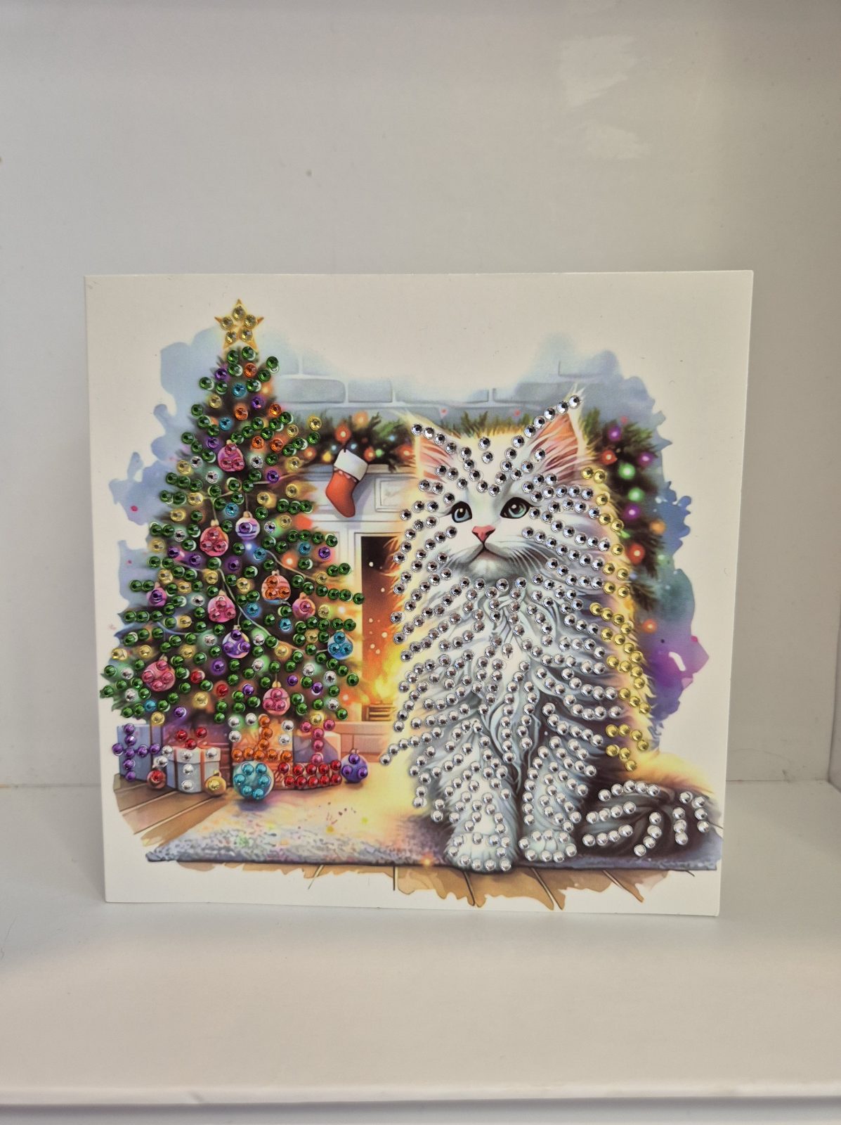 cat with a christmas tree 150x150mm card. blank on the inside for your own Christmas Wishes.