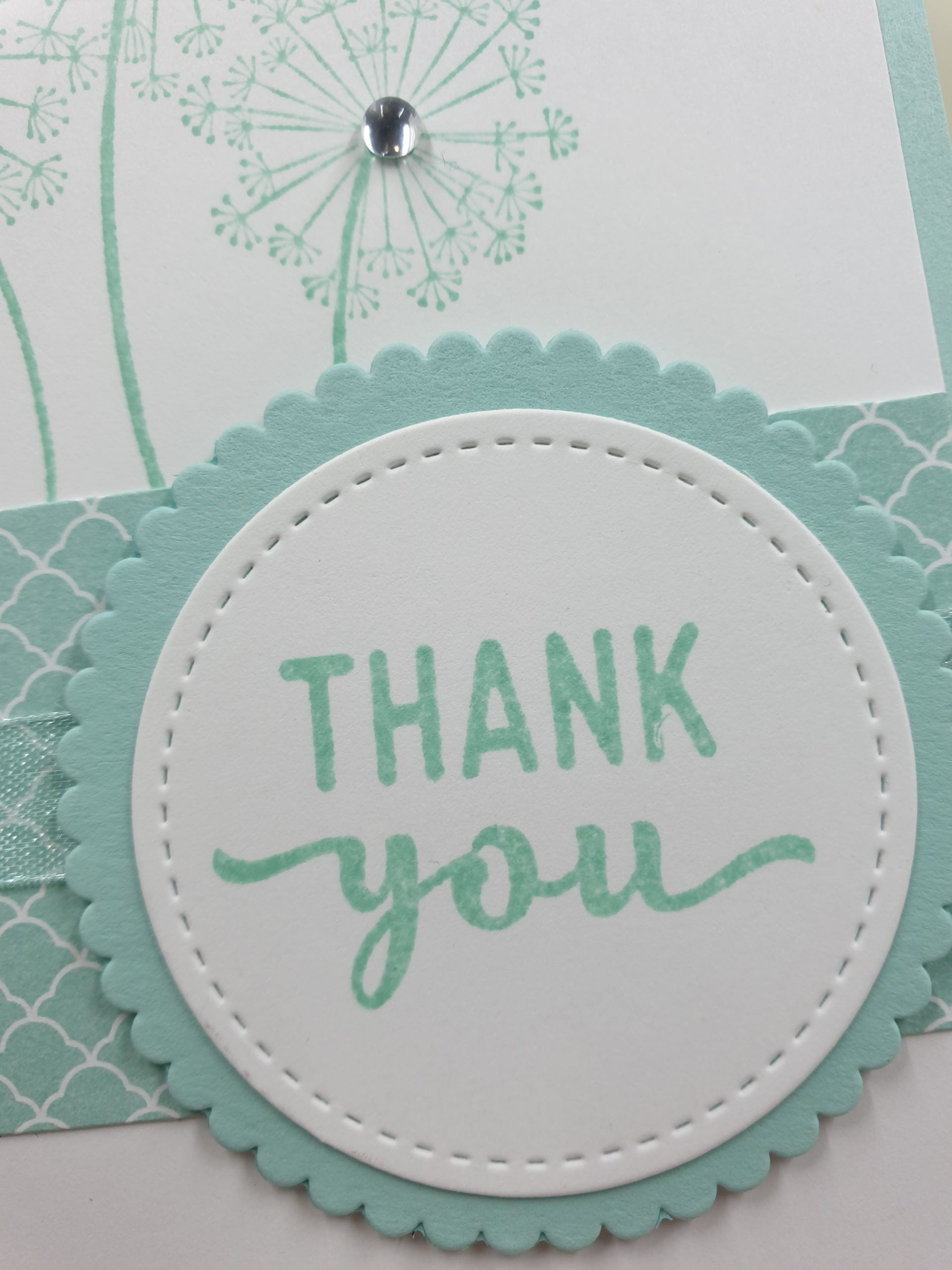 A6 soft blue card base with white layer 3 dandellions stamped in blue ink with pearls in the centre. small piece of patterned paper and stripe of ribbon across bottom. blue scallop circle with white stitched circle “thank you” stamped in blue ink. blank white panel inside, white envelope included.