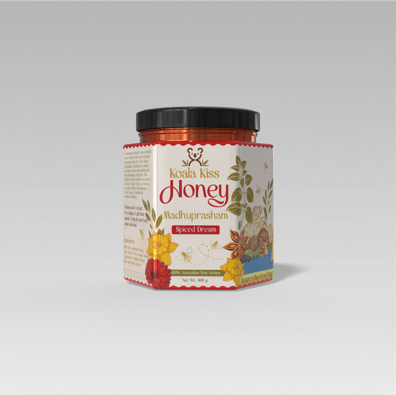 Ingredients: 100% Raw Australian Honey, Tulsi, Fennel, Clove, Ginger, Nutmeg, Cardamom, Cinnamon, Mace, Star anise, Black pepper
